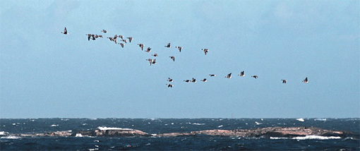 Strax innan september slog igen butiken vädrades landskapet efter konstens alla regler. Vid Kråkudden på Hönö frustade och pustade ett grönsvart hav samtidigt som brungråa morgonfärger porträtterade fjällabb och spetsbergsgäss (två av gässen föreföll dessutom vara märkta på halsen – se inringade fåglar, bild längst ned under aktuellt datum).