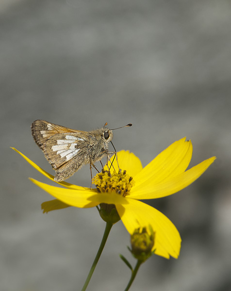Ibland ser inte fjärilar ut som man förväntar sig. En silversmygare på en blomma i vår trädgård. Smygaren ser inte ut som man förväntar sig att en smygare skall se ut.