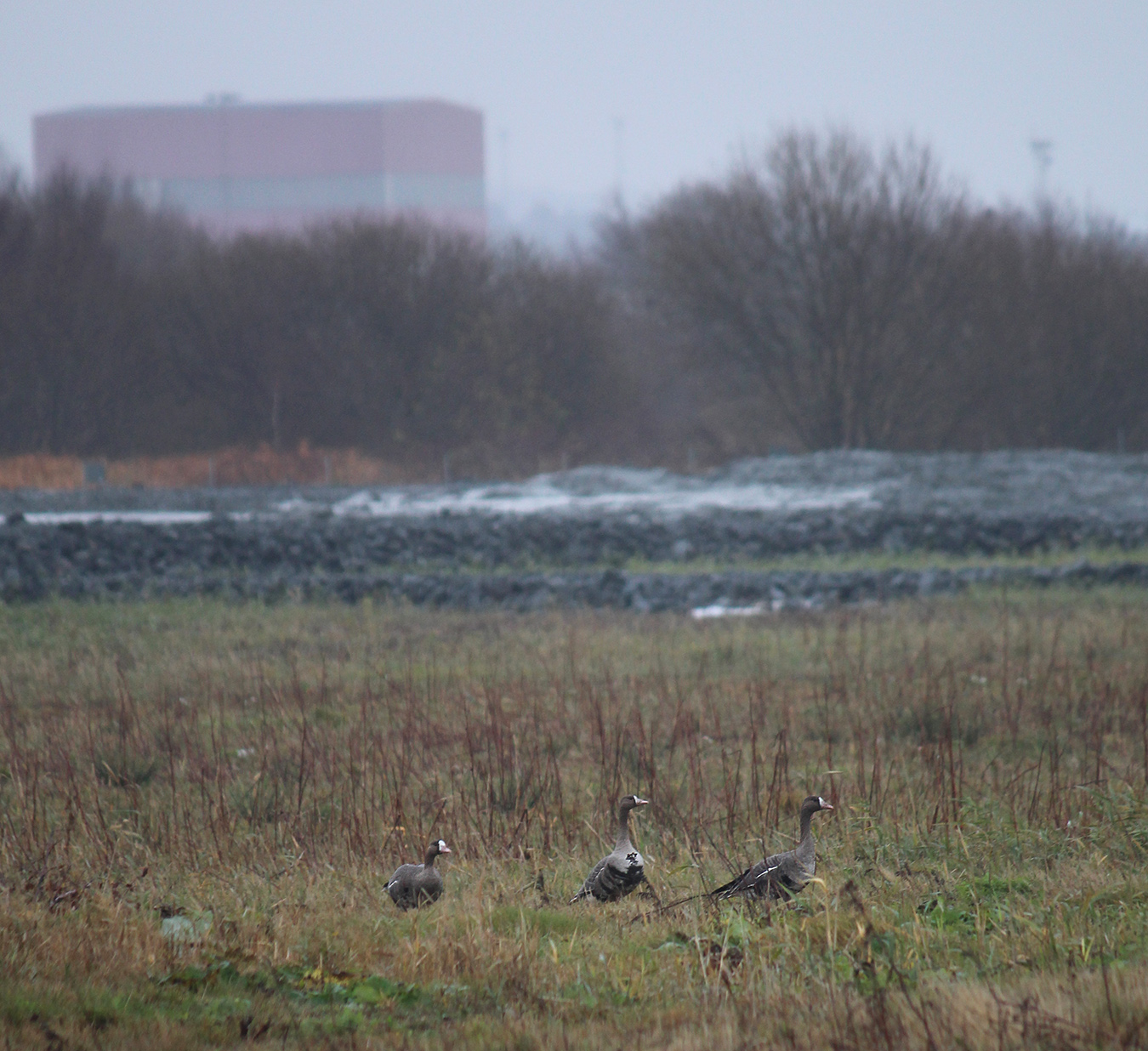 Jag tittar ut över det bleka landskapet och ser ett litet gåshuvud med vit bläs som sticker upp från gräset på mudderdammen, och där ett huvud till och ytterligare ett – tre bläsgäss!