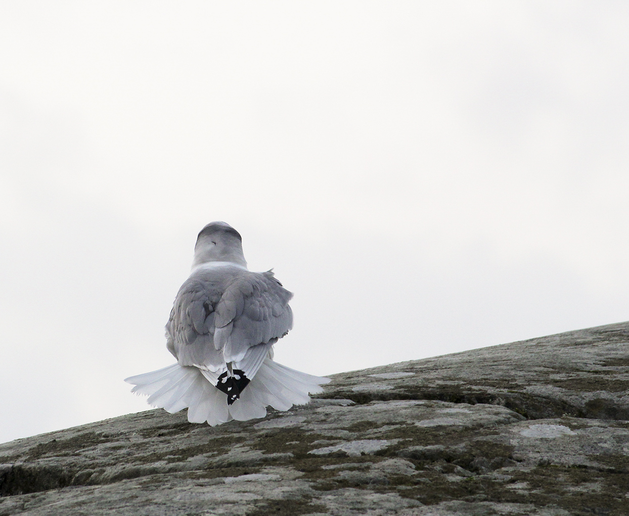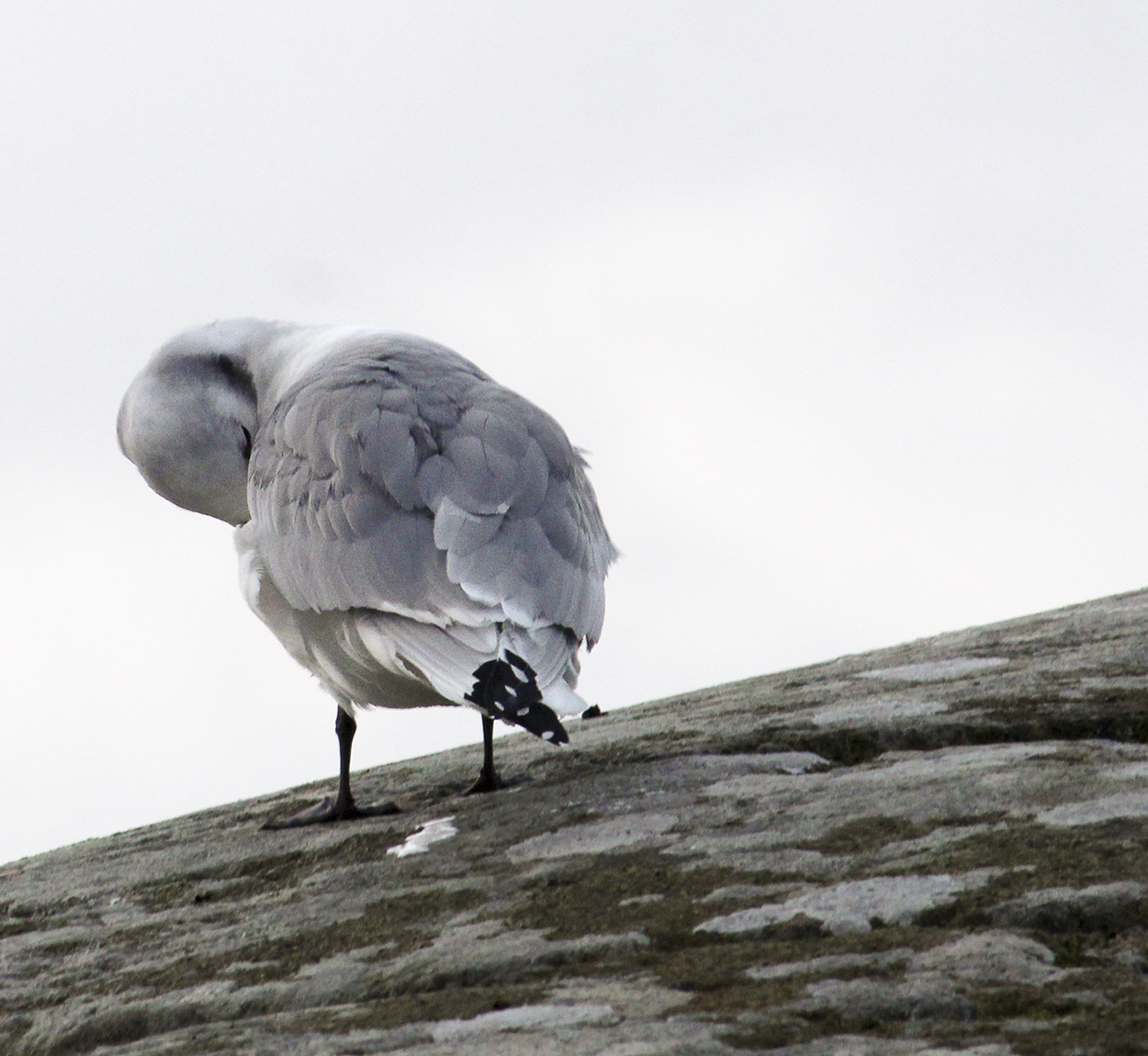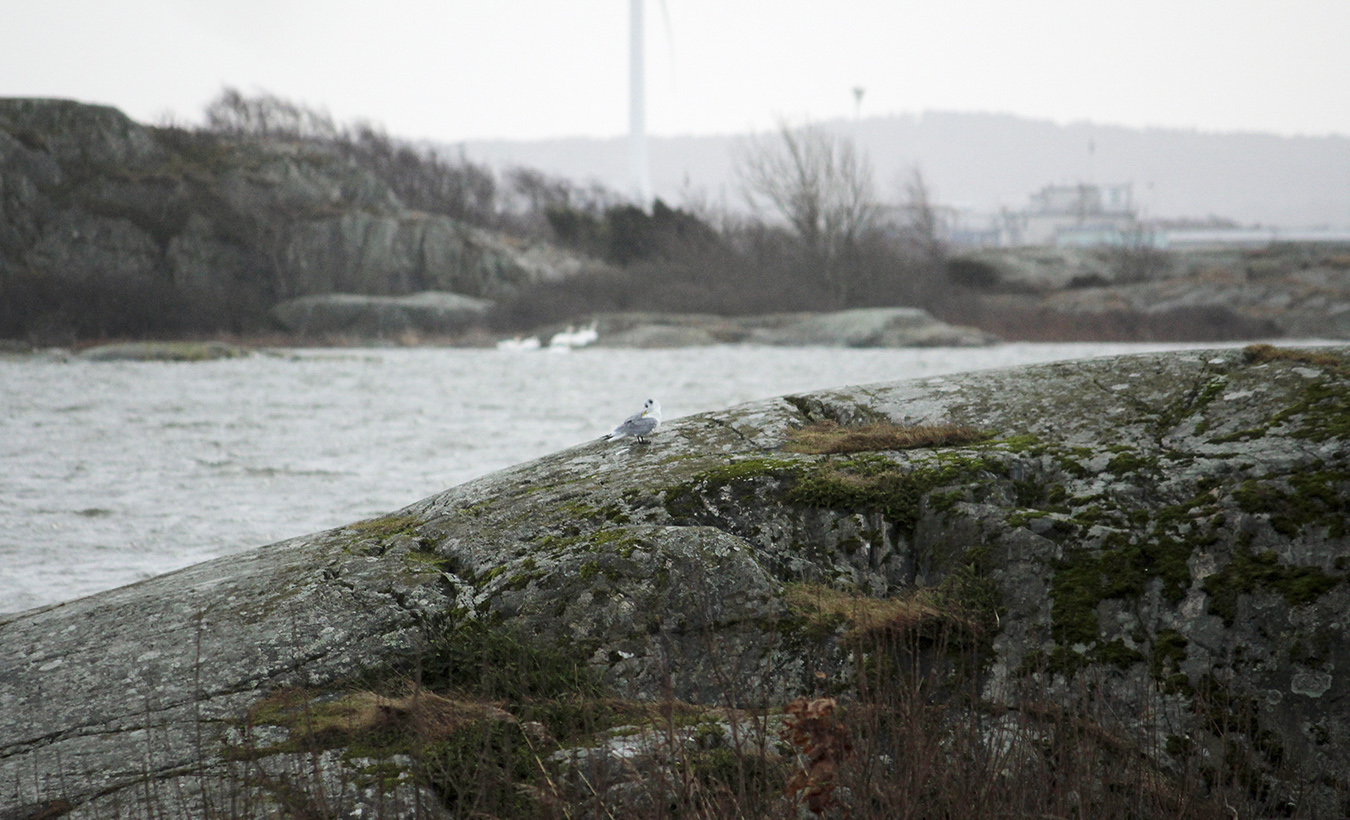 När jag kliver ur huset så tar det inte ens en minut förrän jag är nere vid havet här i Sandvik. Och vad är det som står där och putsar sig på läsidan av berget vid badstranden? Adult tretåig mås i vinterdräkt! Elegant (höll på att skriva söt) är ordet!