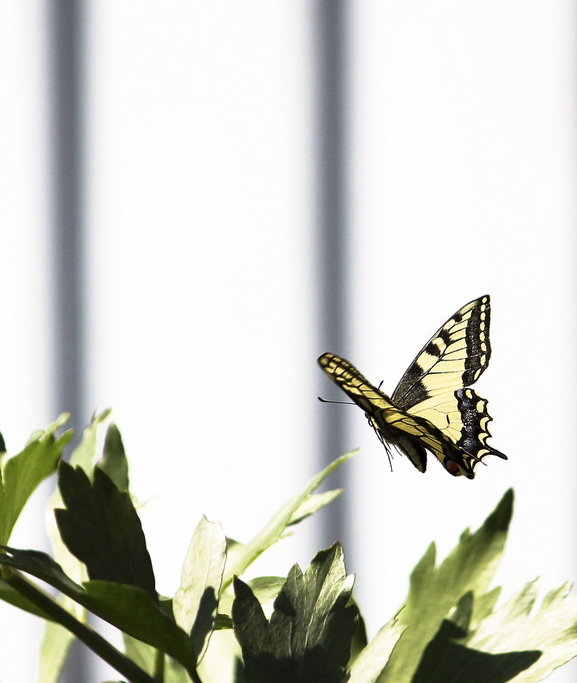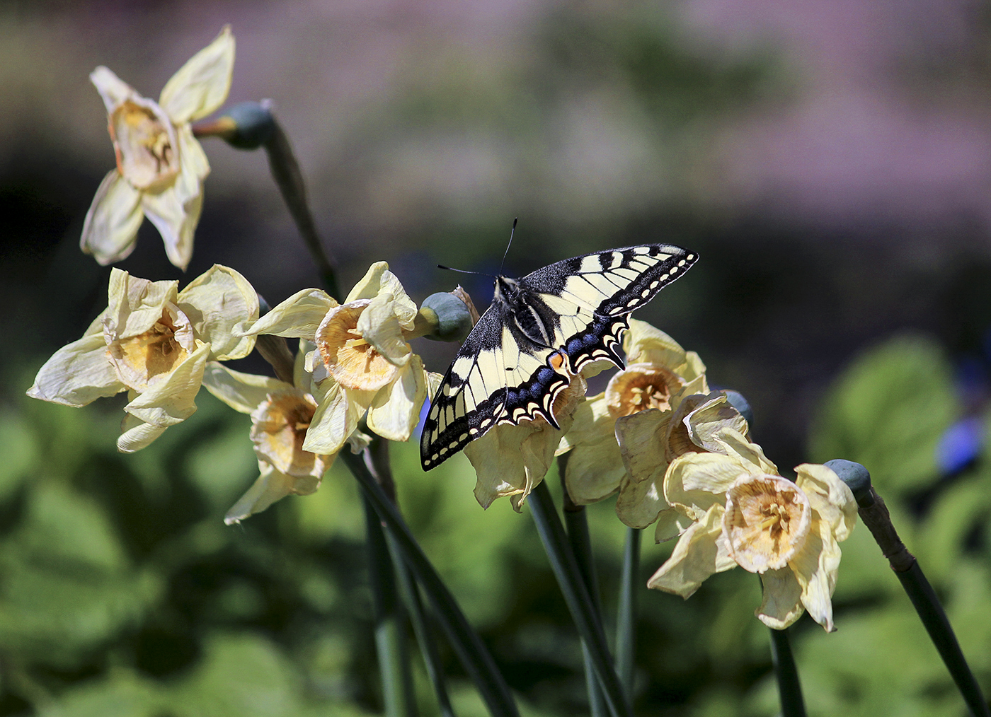 Äntligen årets första makaonfjäril! Efter några hastiga och tvära rallysvängar i min trädgård flög den över till min grannes trädgård och började lägga ägg på en libbsticka! Sex stycken lyckades jag hitta på bladen när den vilade en stund på en påsklilja.