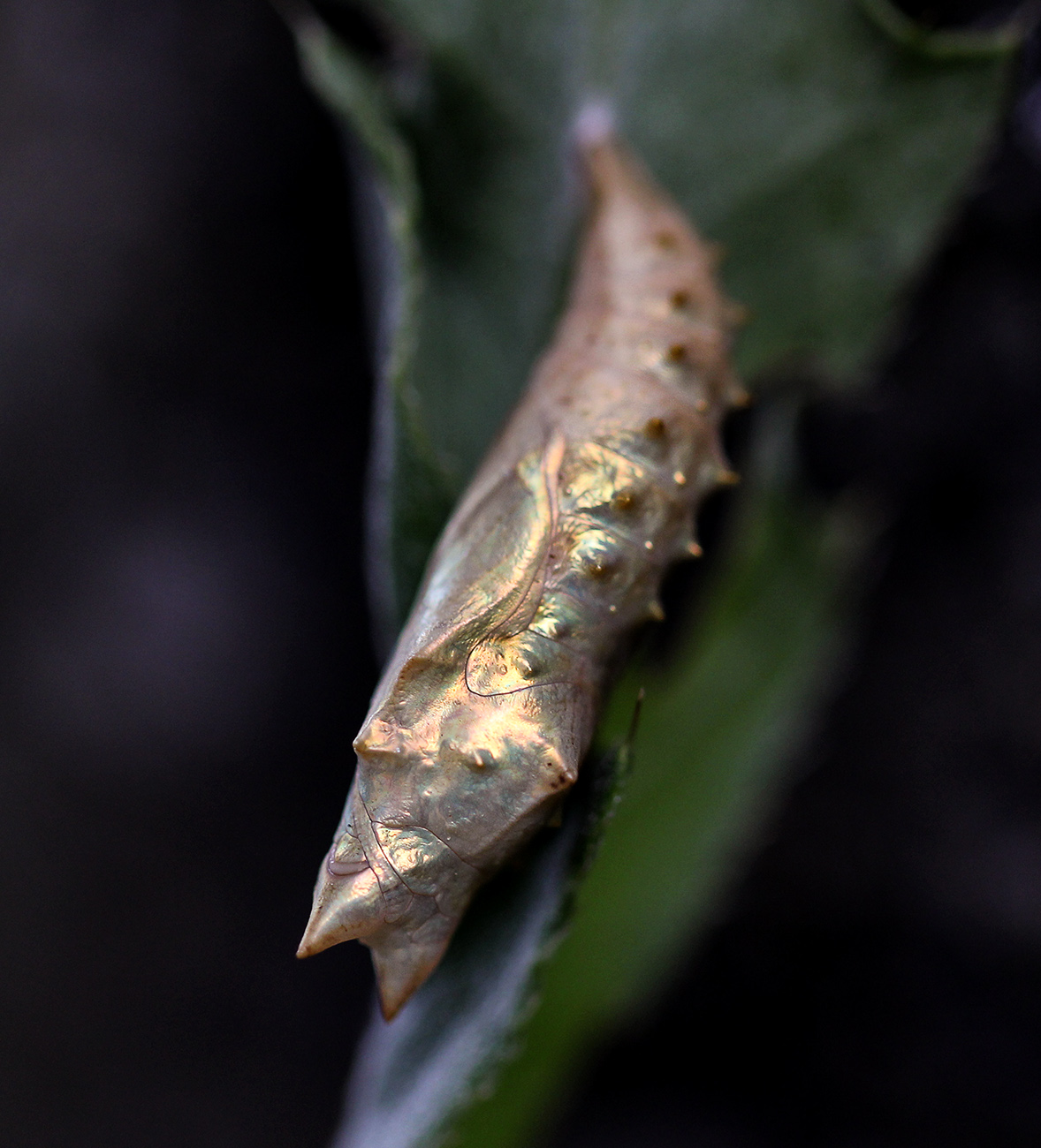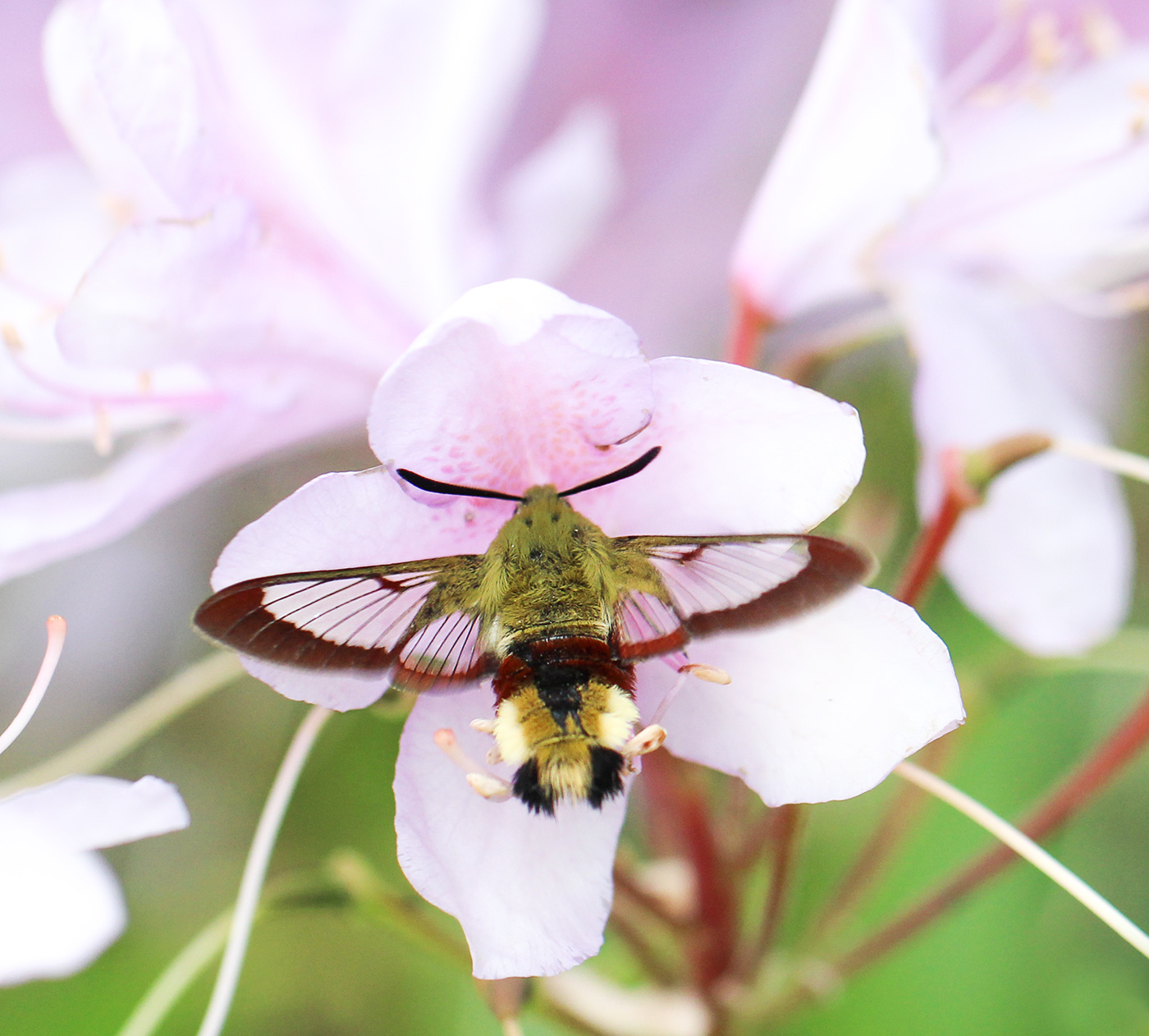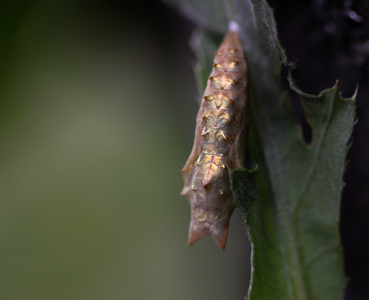 Min äldsta son hittade en puppa nässelfjäril och den gnistrade som vore den målad i guld och silver. Och trots att det var mulet och regn i luften besökte en humledagsvärmare en av våra rhododendron.