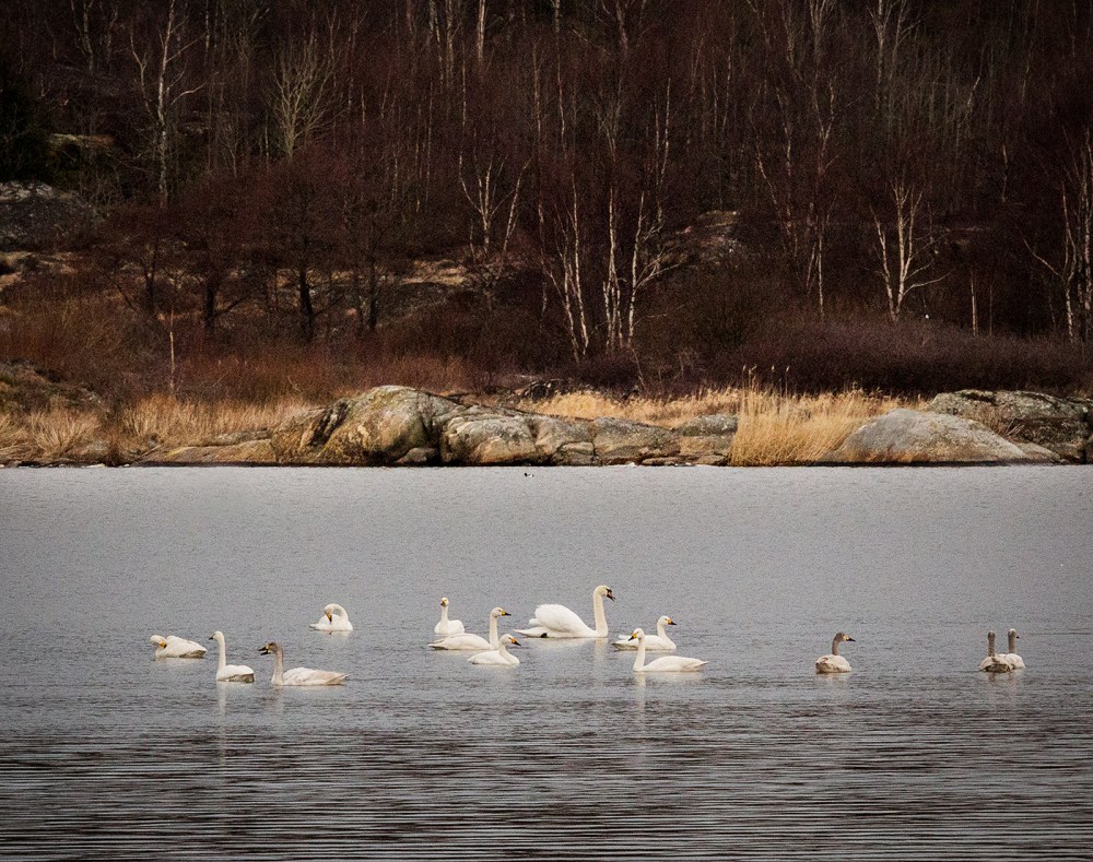 Så trängde plötsligt envisa ”hundskall” fram ur gråvädersmolnen, och i nästa ögonblick kunde jag lokalisera 24 mindre sångsvanar som var på ingång över viken! Först cirkulerade de villrådigt, innan de landade med högljutt plask i Karholmsdammen. Genast började de knixa och trixa med halsarna, men så småningom övergick det valpiga beteendet till gnyenden och stillsam persedelvård efter den mörka och kyliga nattresan från Danmark.