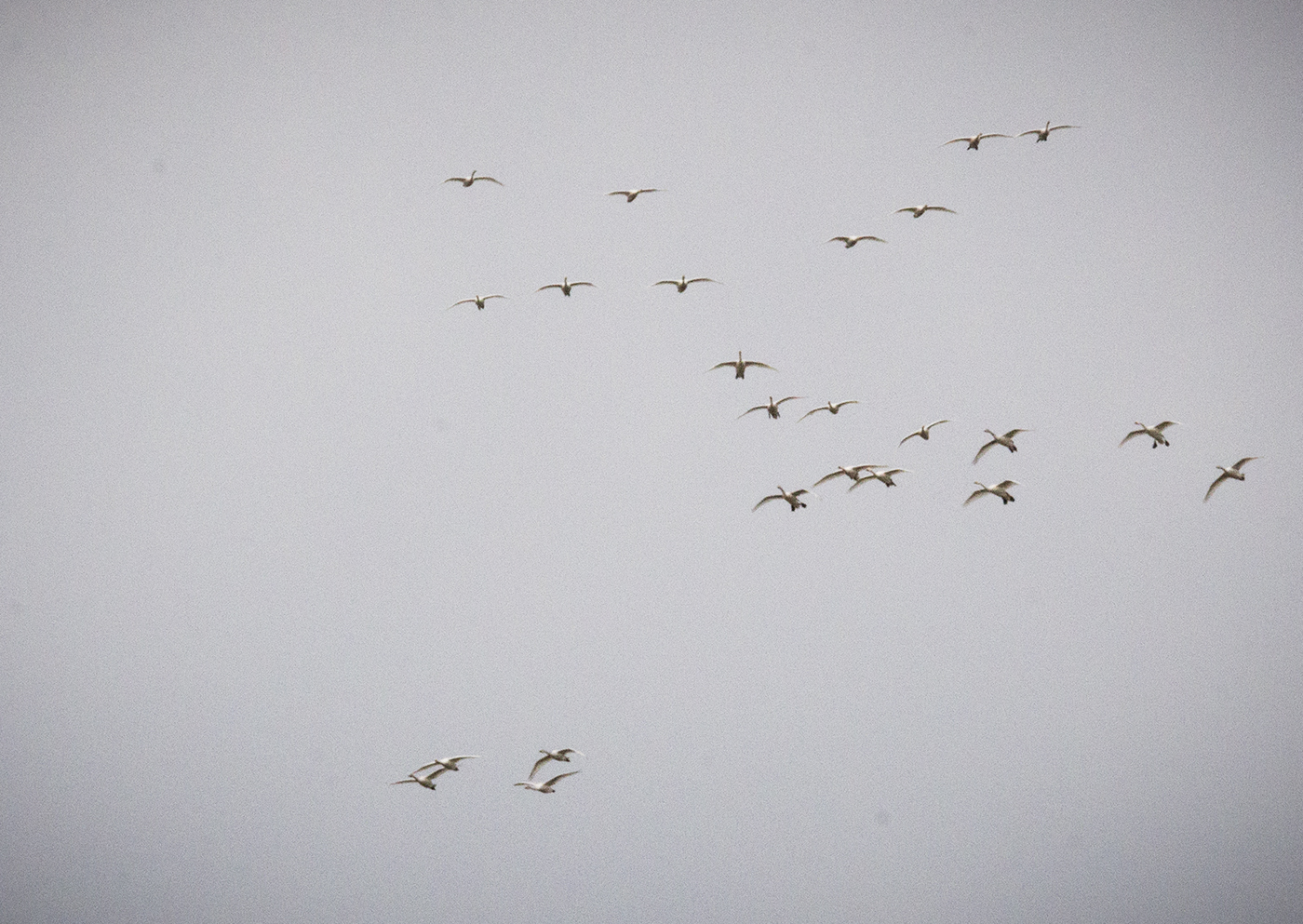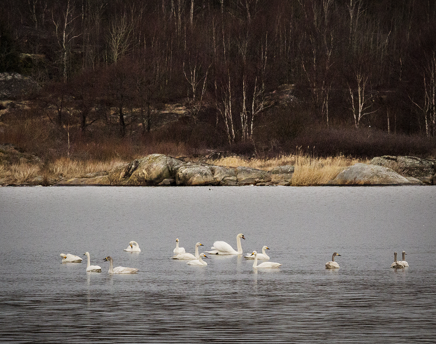 Så trängde plötsligt envisa ”hundskall” fram ur gråvädersmolnen, och i nästa ögonblick kunde jag lokalisera 24 mindre sångsvanar som var på ingång över viken! Först cirkulerade de villrådigt, innan de landade med högljutt plask i Karholmsdammen. Genast började de knixa och trixa med halsarna, men så småningom övergick det valpiga beteendet till gnyenden och stillsam persedelvård efter den mörka och kyliga nattresan från Danmark.