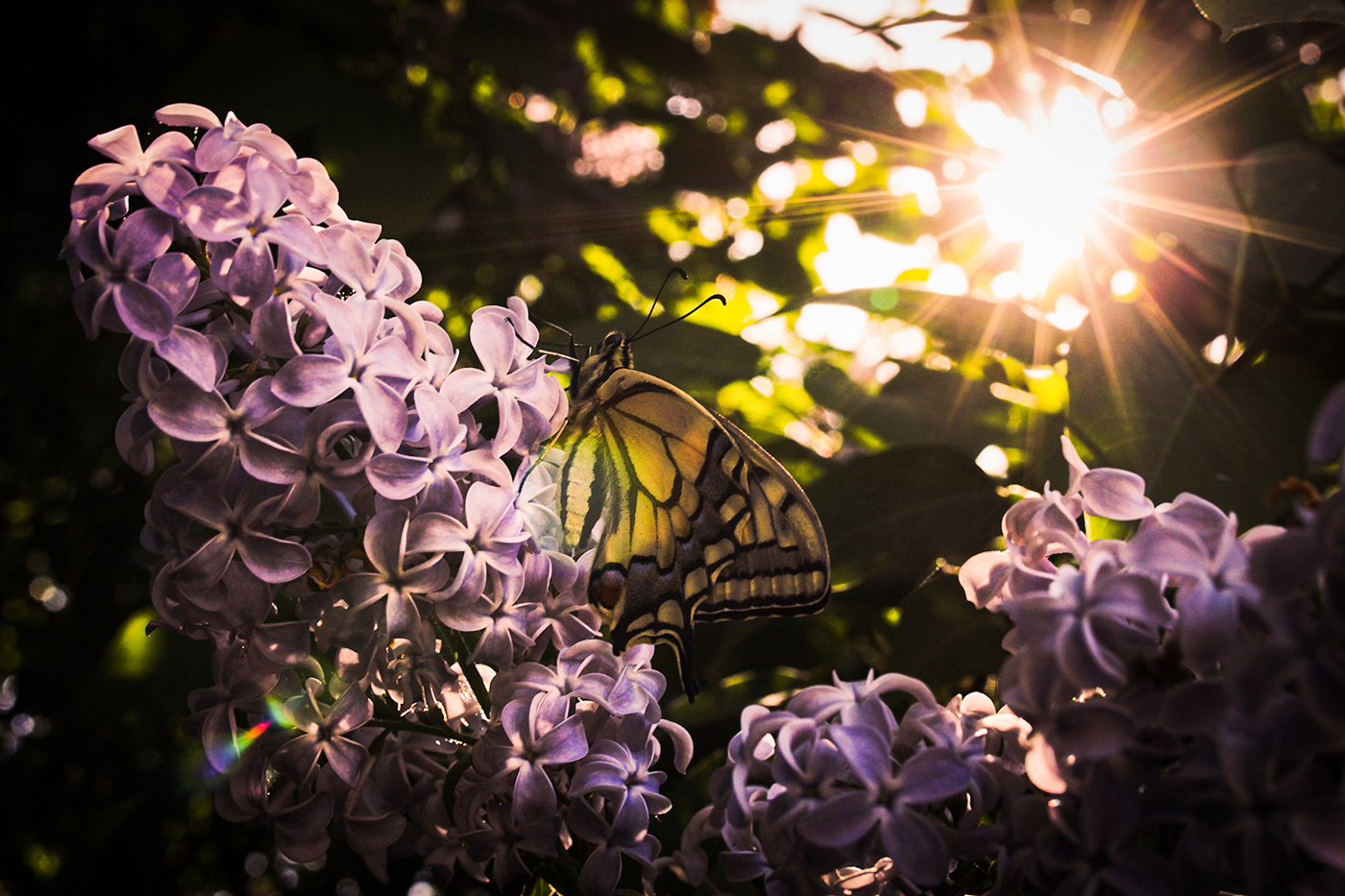 Syrenerna blommar och gungar lätt i majvinden. Hastigt övergående är deras blomningstid och lysande prakt. Den ståtliga makaonfjärilen glänser i motljuset och besöker med förkärlek den väldoftande växten.