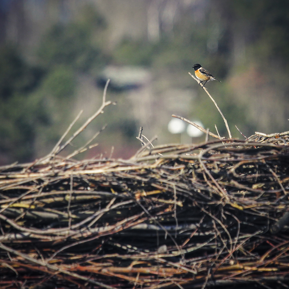 Konstverket ”Svanbon” och fågelarten svarthakad buskskvätta. En hane.