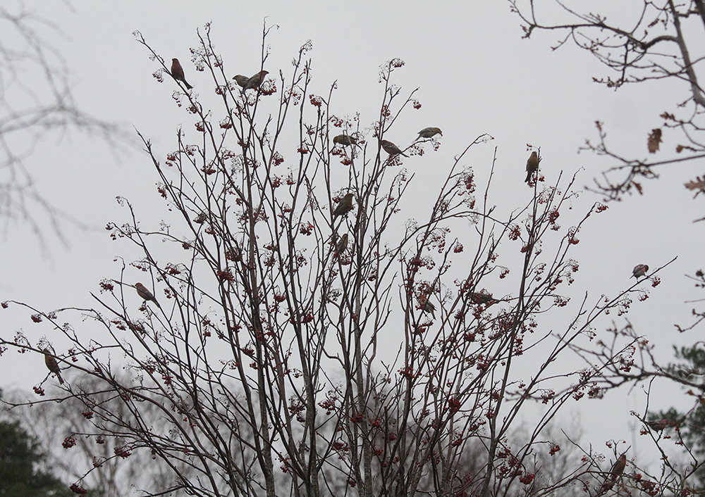 Tallbit, 16 ex på bilden, därtill sitter 5 ex i en annan rönn vid fotoögonblicket. Amhults damm, Amhult, den 26 november 2019.