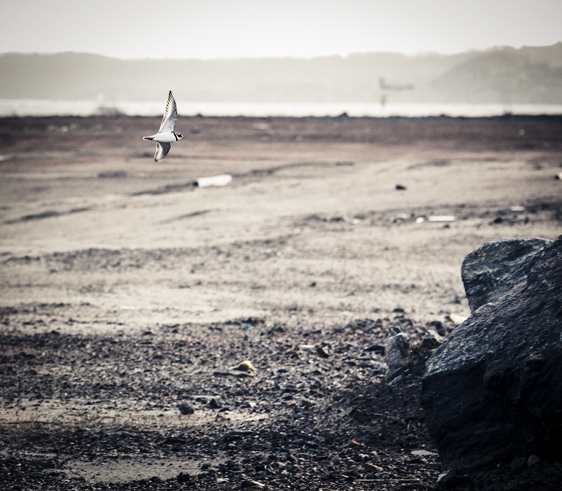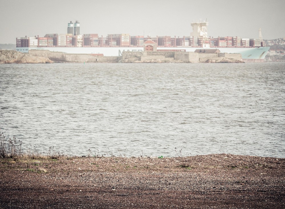 Större strandpipare och i bakgrunden Nya Älvsborgs fästning och världens största containerfartyg, Risholmsudden, Torslandaviken den 23 februari 2020.