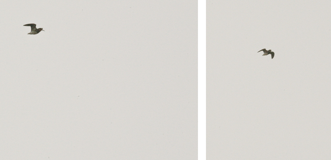 Dvärgbeckasin, ”tennisboll”, Torslanda golfbana, Torslandaviken, den 24 mars 2021 (fotomontage, övre bilden, samma individ på alla tre bilderna).