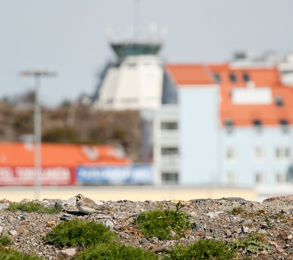 Berglärka, Torslanda golfbana, den 9 april 2022. I bakgrunden ser man en del av Amhults centrum och det gamla flygledartornet.