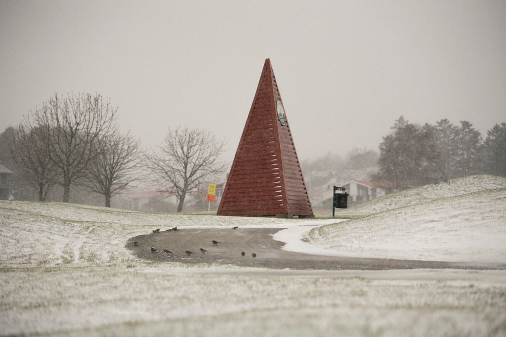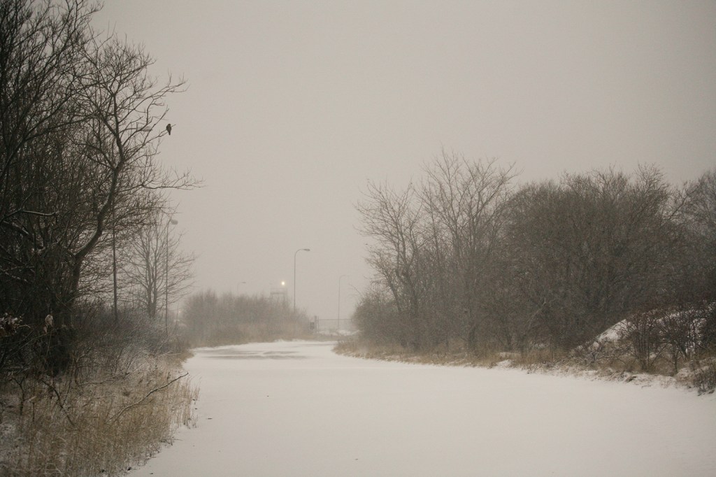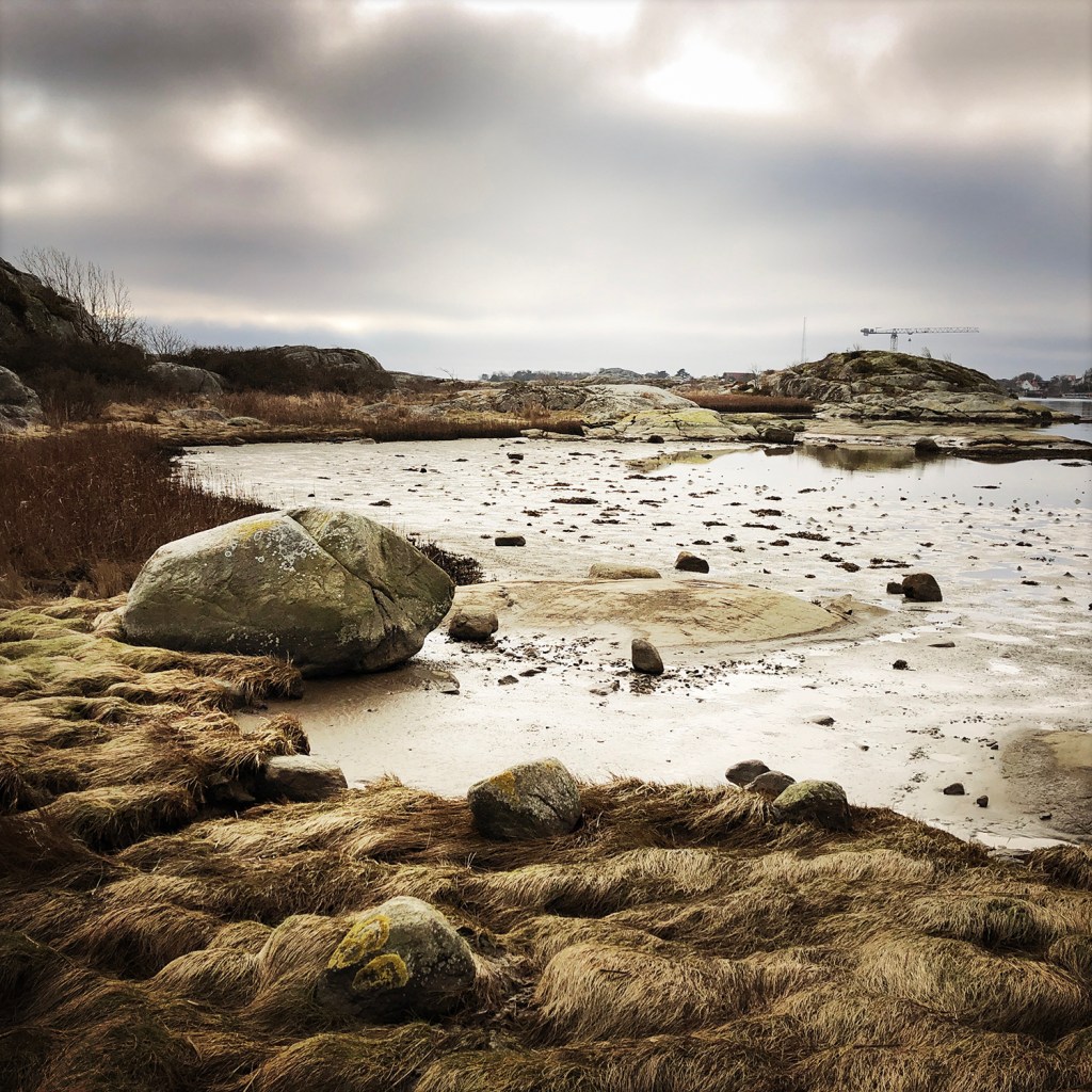 Skeppstadsholmens nordvästra strandäng, Torslandaviken, den 22 januari 2023. I bakgrunden, tvärsöver Skeppstadsviken, ser man en lyftkran, den står på Krossholmen.