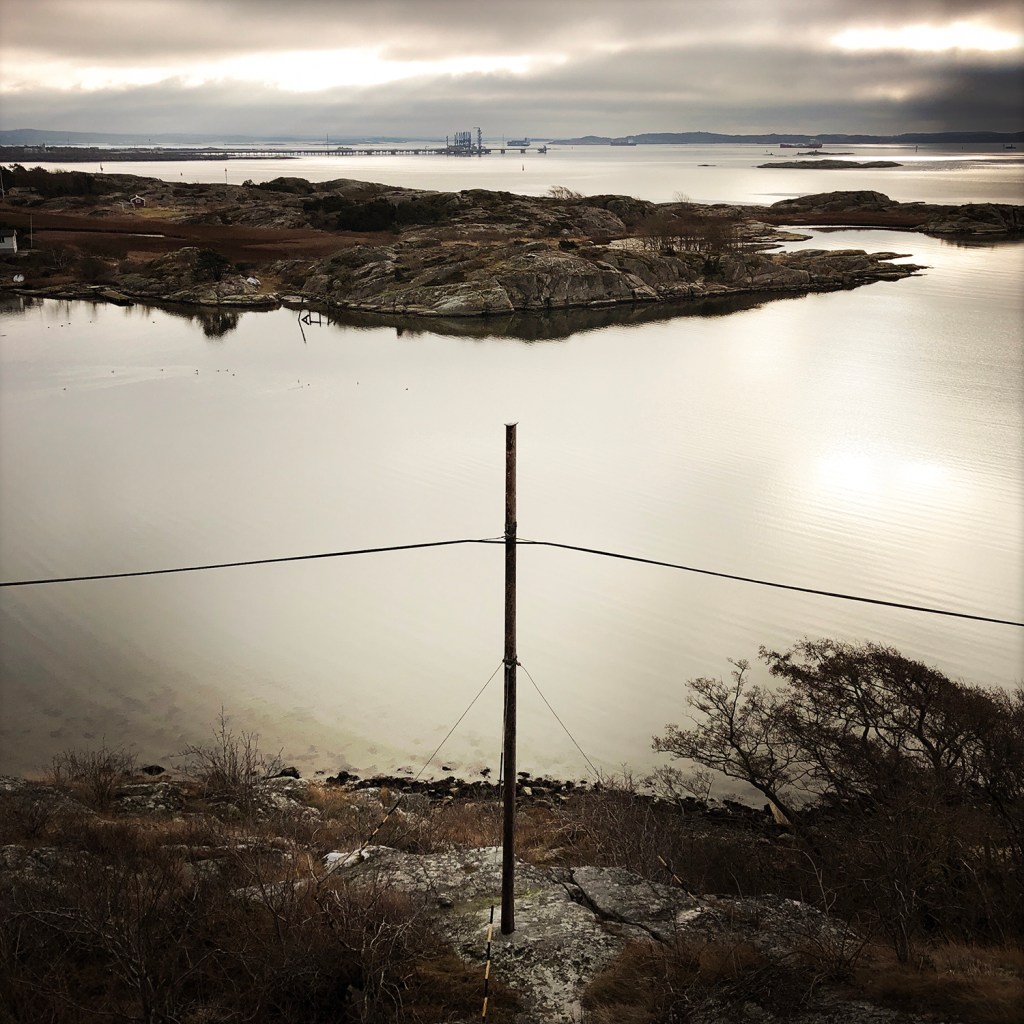 Utsikt över Hjärtholmsviken, Torslandaviken, den 22 januari 2023. På övre delen av bilden ser man Hjärtholmen.