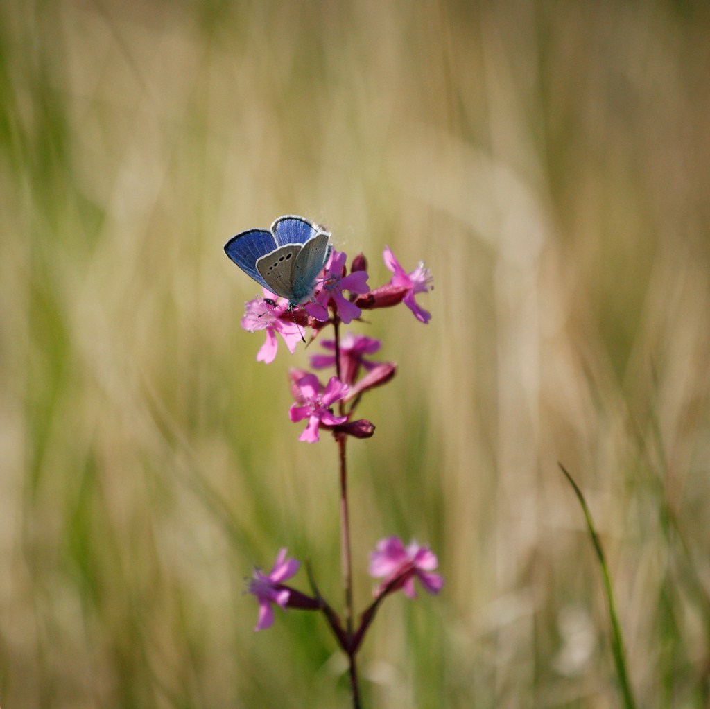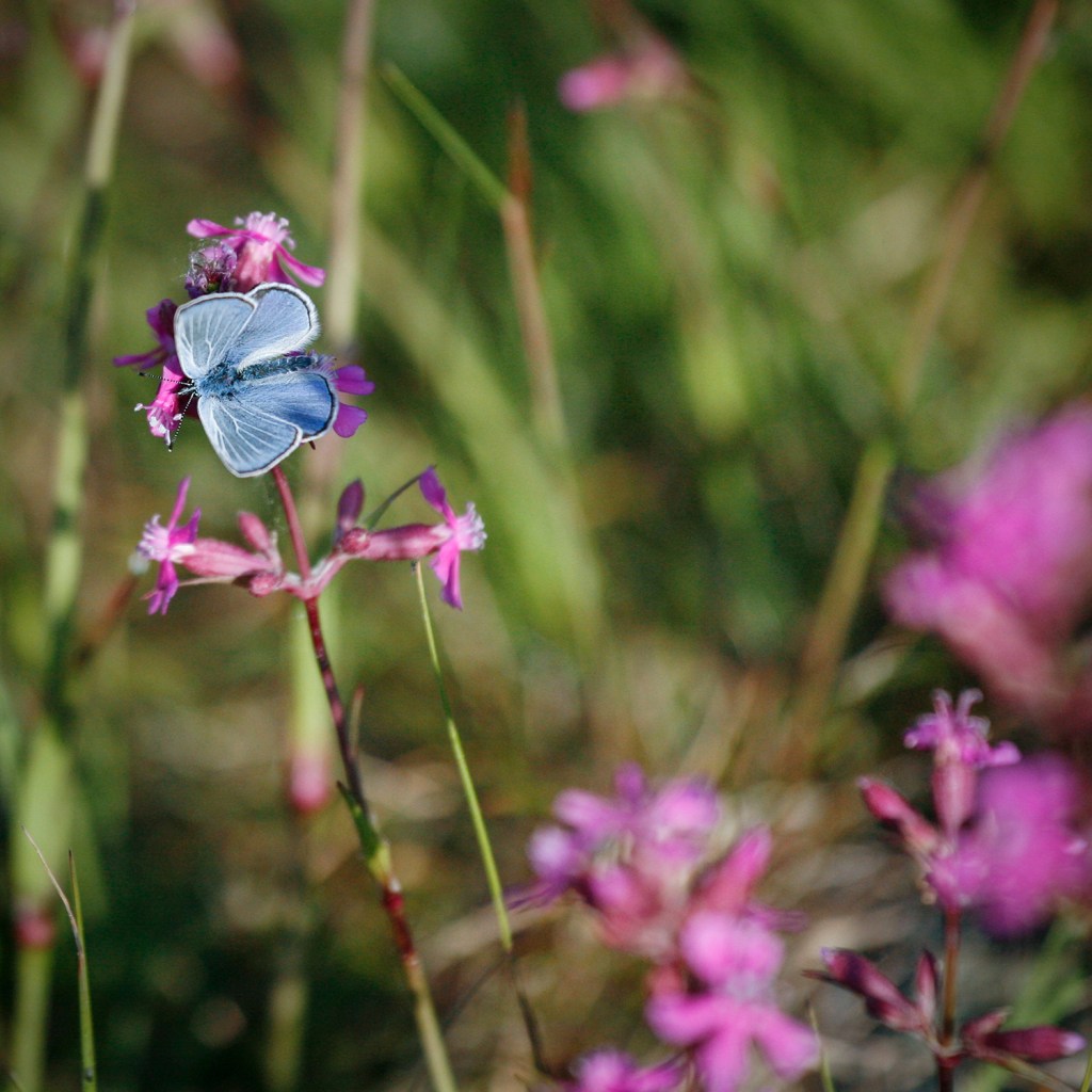 En hane klöverblåvinge och tjärblomster, Torslandaviken, den 21 maj 2023.