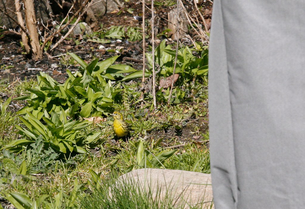 Den lilla fågeln på gräsmattan lyfte och flög någon meter eller så och tog mark på en odlingslåda som står intill huset. Då såg jag den ordentligt i handkikaren och stod nästan på öronen av förvåning, det är ju en gulhämpling!