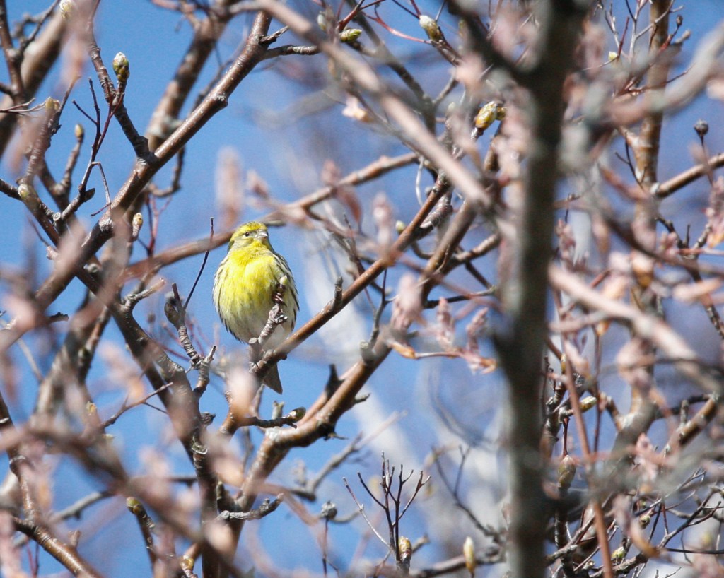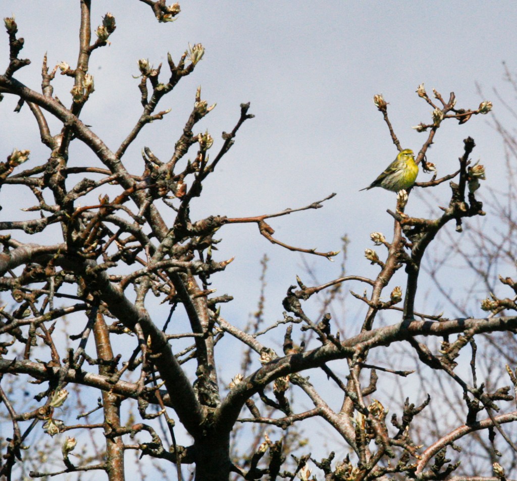 Gulhämpling, en hane i ett av mina fruktträd. Lockade lite då och då med sitt ljusa, porlande tofsmeslika läte.